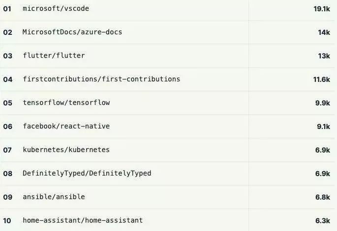 今年,最受欢迎的开源项目已经有 10K 的贡献者。其中,有两个自从 2016 年就已经上榜:vscode(微软)和 ansible。在 2019 年新上榜的有:flutter、first-contributions 和 home-assistant。