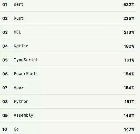 而最快增长的语言方面,Dart 是增长最快的编程语言。此外,Rust、Kotlin 和 TypeScript 的社区都在快速增长。