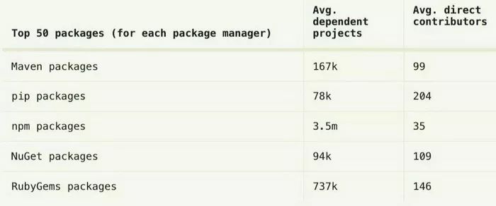 从包管理工具上也可以看到相似的趋势。上榜的每个编程语言的生态系统都十分活跃,依赖项目都很多。