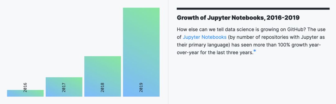 从2016年到2019年,Jupyter Notebook的使用量连续三年增长率都超过100%。