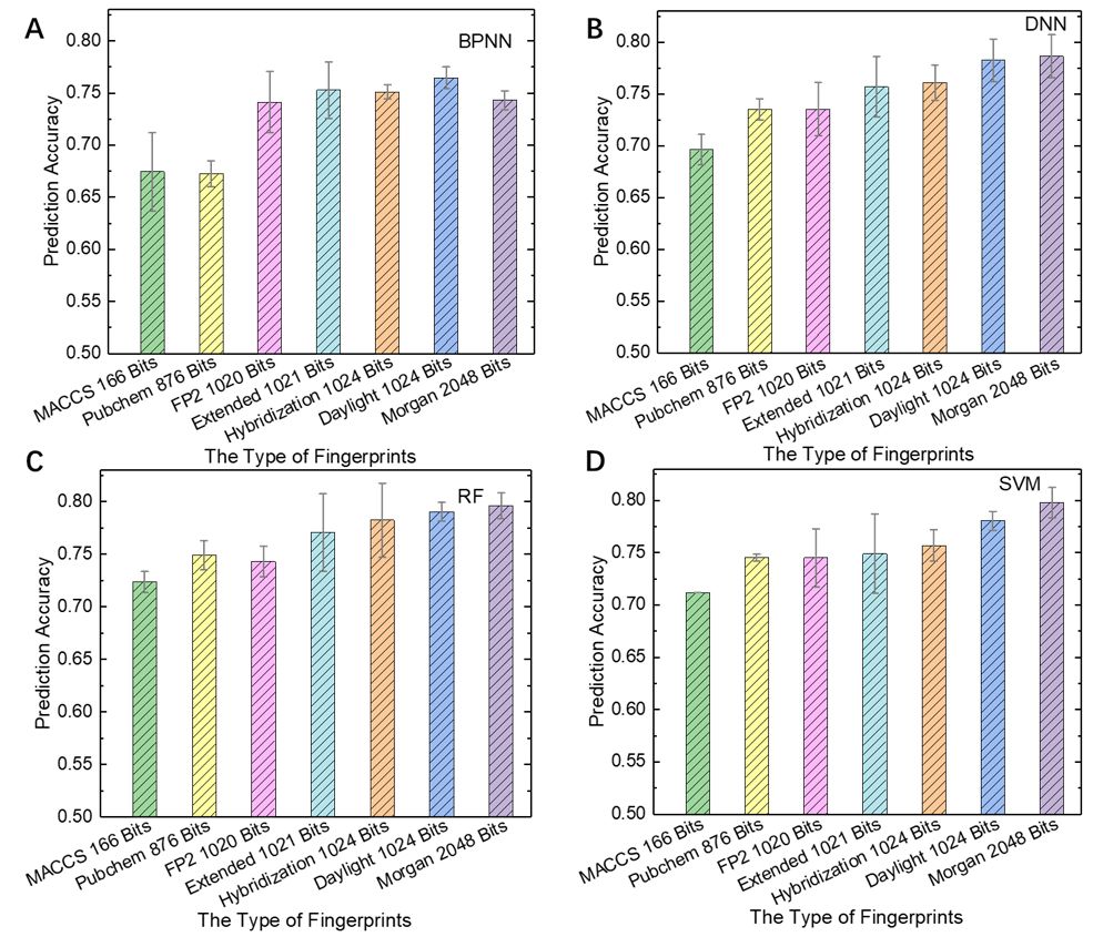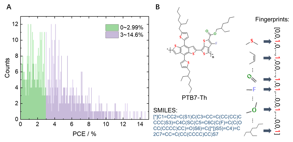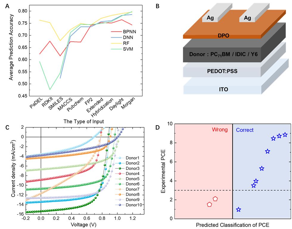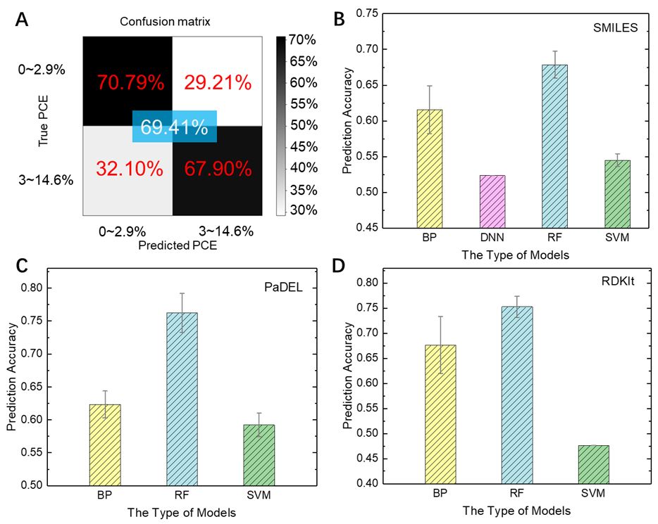 1. 本文探索了有机光伏材料分子结构的多种机器语言表达形式,如图片、ASCII码字符串、分子描述符及分子指纹等,并将其作为不同机器学习算法的输入。2. 本文将机器学习算法预测同实验相结合,利用设计的10种全新的给体材料分子,通过实验验证了机器算法的可靠性。3. 本文提出了一种新的材料开发流程,即利用机器学习对大量潜在的材料分子进行预评估和筛选,并对通过筛选的材料进行进一步的实验测试。该方法可极大地提高新材料开发的效率。有机太阳能电池是一种将太阳能转化为电能的直接且经济的方式。近年来,有机太阳能电池研究经历了快速发展,光电转换效率(PCE)已超过17%。直到现在,有机光伏研究主要致力于建立新的材料分子结构与其光伏特性之间的关系。该过程通常涉及光伏材料的设计与合成,材料光电性质的表征,以及光伏电池的组装和优化。这种传统方法包括对化学合成和器件制备进行精细控制及优化,需要显著的资源投入和较长的研究周期。因此有机光伏材料的开发效率一直较低,自1973年有机太阳能电池被首次报道以来,仅在光伏器件中合成并测试了不到2000种有机太阳能电池给体材料分子。不过,这些经由数十年探索所产生的实验数据却是宝贵的。而且到目前为止,在寻找高性能有机光伏材料时它们的潜在价值尚未得到充分利用。为了从这些数据中提取有用信息,需要一种能够扫描大量数据集并提取特征之间关系的程序。机器学习正是满足要求的一种算法。其提供了一套计算工具,能够根据误差(或损失函数)最小化或概率规则(例如最大化似然性)学习和识别模式或关系,并预测结果或做出决策。这种数据驱动的方法使机器学习能够预测广泛的材料特性,而无需对这些特性背后的化学或物理学原理有基本的了解。近日,重庆大学能源与动力工程学院孙宽研究员带领的柔性可再生能源材料与器件(La FREMD)团队联合自动化学院、计算机学院、经管学院、华北理工大学以及中国科学院重庆绿色智能技术研究院的多个团队,在开发高性能有机太阳能电池给体材料的过程中,利用机器学习在合成新材料之前建立化学结构和光伏特性之间的关系,并对新材料进行效率预测。作者首先建立了一个包含已被文献报道过的1700多种有机太阳能电池给体材料的数据库。通过监督学习,作者的机器学习模型可以建立结构 – 性质关系,从而实现有机光伏材料的快速筛选。作者探索了数种分子结构的表达形式,如图像、ASCII码字符串、分子描述符及分子指纹等作为多种机器学习算法的输入,发现长度超过1000位的分子指纹可获得高预测准确率,是进行机器学习的最佳表达形式。此外,作者利用机器学习模型预测了10种新设计的给体材料,模型的预测结果和实验结果之间的具有良好的一致性,可进一步验证机器学习方法的可靠性。结果表明机器学习是预评估和筛选有机光伏新材料的有力工具,该方法可加速有机太阳能电池领域的发展。该成果11月9日在Science Advances (IF=12.8) 上在线发表,重庆大学的孙宽研究员和中国科学院重庆绿色智能技术研究院的陆仕荣研究员、肖泽云研究员为共同通讯作者,硕士生孙文博、郑玉杰博士和博士生杨可为共同第一作者。图1 有机太阳能电池给体材料数据库。(A)数据库中1719个材料分子对应的光电转换效率(PCE)分布情况。(B)分子结构表达形式的示意图,包括图片、SMILES及分子指纹。作者使用的数据库包含从文献中收集的1719个经实验合成的有机太阳能电池给体材料。为了获得更通用的机器学习模型,数据库中将聚合物和小分子给体材料混合在一起,且电池器件中使用的受体是富勒烯还是非富勒烯也被忽略了。如果某种给体材料已被多次报道,则选择最高的PCE。所有这些标准确保模型可以学习某种材料的最大潜力。在建立的数据库中,PCE的中位数为2.82%,平均值为3.48%。为了获得一个无偏斜的机器学习二分类模型,需要平衡两个类别中每一个类别的数据数量,即使两个类别中的分子数量大致相等。因此将数据分为两类,并选择3%作为初始阈值。PCE在0~2.99%范围内的分子被视为“低性能”,而高于3.00%的分子被视为“高性能”的有机光伏材料。为了讨论分类阈值如何影响预测准确性,文章同样选择了10.00%作为二分类的标准并进行了相关实验。在进行机器学习建模时,数据需要被随机划分为训练集及测试集,其比例为9:1。包括图片,ASCII码字符串,两种分子描述符和七种分子指纹在内的分子结构的多种表达形式被用作机器学习模型的输入以预测PCE。这项工作中考虑的所有分子表达形式都很容易获得。其中,图片是材料的一种直观表达;SMILES (simplified molecular-input line-entry system) 使用短ASCII字符串描述化学物质的结构;分子描述符表达分子的结构特征及其他性质;分子指纹是由‘0’和‘1’组成的字符串,可反映分子中特定子结构/模式的存在与否。图2 (A)使用图像作为输入的深度学习模型的测试结果。 使用(B)SMILES,(C)PaDEL和(D)RDKIt描述符作为输入的不同机器学习模型的测试结果。机器语言表达是机器学习方法中的一个重要方面,因为它将原始数据转换为计算机可读的表示形式。同一分子的各种表达包含非常不同的化学信息,或者该信息以不同的抽象水平呈现。 理想的表达形式应涵盖分子的几乎所有特征,但不包含冗余信息。本文中,通过对比一