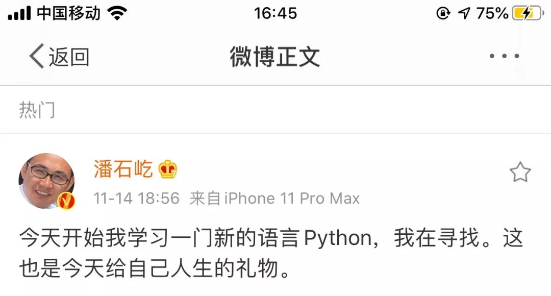 11月14日,在新浪微博上潘石屹宣布他开始学习 Python 语言了。“今天开始我学习一门新的语言Python,我在寻找。这也是今天给自己人生的礼物。”
