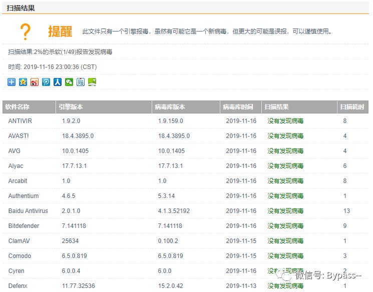 扫描结果:47款杀毒引擎中,只有一个引擎报毒,主流的杀毒软件全部绕过。网站地址:http://www.virscan.org