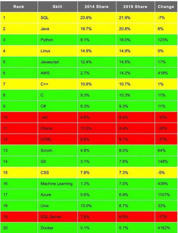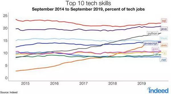 虽然这一次 Python 和 AWS 仅仅排在第三名和第六名,但重点在于,这二位的热度在过去的五年中分别上涨了 123% 和 418%。相比之下,排在第二名的 Java 上升缓慢,而还在榜首的 SQL 甚至出现了下跌趋势。