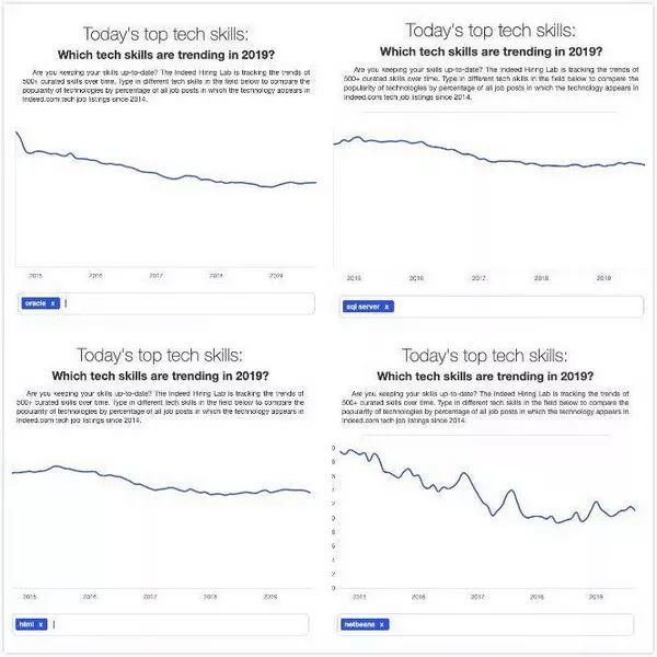 表格中的红色区域是热度下降较为明显(超过 10%)的几项技能,包括Oracle(-38%)、HTML(-17%)、SQL Server(-17%)、.net(-15%)。从下面的曲线图中可以更加直观地看到这种趋势。
