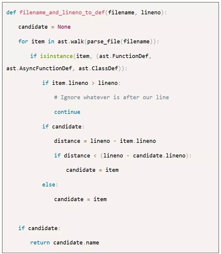 问题是这样的:假设有一个文件名和一个行号,您能说出这行代码属于哪个函数、方法或类吗?