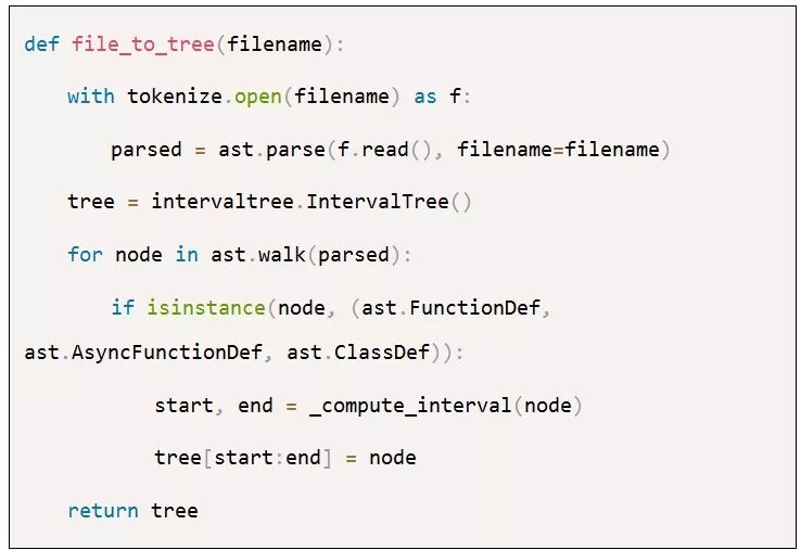 就是这样:该函数会解析作为参数传入的Python文件,并将其转换为它的AST表示。然后遍历它并为区间树提供每个类和函数定义。