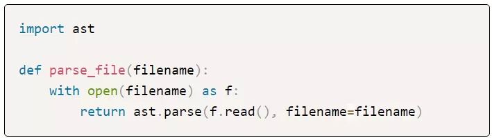 parse_file函数现在会返回一个Python AST。如果您从未使用过Python AST,那么它是一个巨大的树,表示您的源代码在被编译成Python字节码之前的样子。