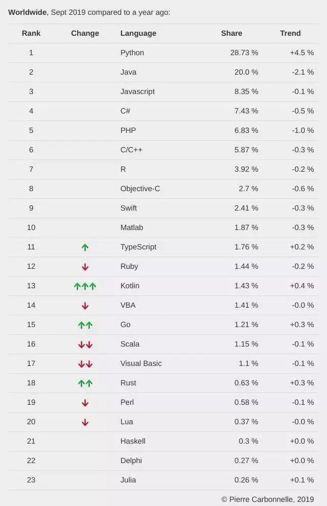 今年 PYPL9 月份的榜单, Python 以 28.73% 的份额封顶榜首。相比去年同期的数据,排行榜前十中只有 Python 份额大幅上涨了 4.5%。Java 下降 2.1%,PHP 下降 1.0%,其它语言份额没有多少变化。
