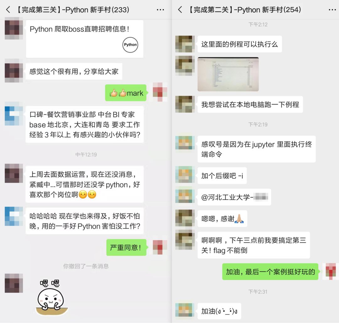 零基础入门最怕遇到问题卡壳,这里有“问不倒”的辅导老师,提供及时答疑服务,哪里不懂问哪里,直到学会为止。还有班主任小姐姐帮大家汇总学习进度,让你每天都有新收获~在这里还可以和更多好学上进的小伙伴一起学习讨论,分享学习经验、探讨方法论、同步招聘信息等。Python编程是一种实用性很强的工具,即将成为被大多人掌握的通用技能,优秀的你还不赶快加入!