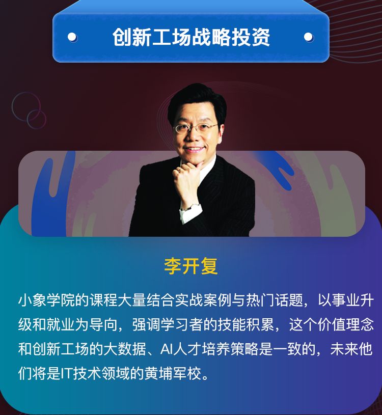 小象学院在人工智能教育领域是出了名的专业、负责,具备非常靠谱的讲师团队和稳定的内容输出, 被AI教父李开复誉为IT届的黄埔军校,并且引领创新工场做战略投资。现已有100W+学员在小象学院学习人工智能和大数据的在线课程。回顾整体的学习内容,不仅仅是知识的堆积,还有很饱满的实用技能,课程中的实际案例,可以直接拿来解决学习和工作中的问题。学完全部课程的同学体验都是:学习过程中并没有天天逼着自己,用了不到一个月的时间,就在不知不觉中学完了!