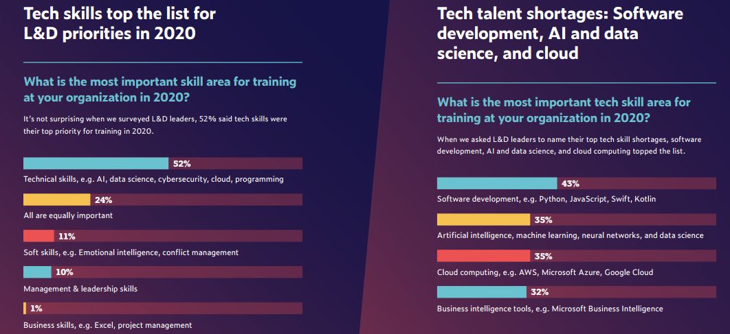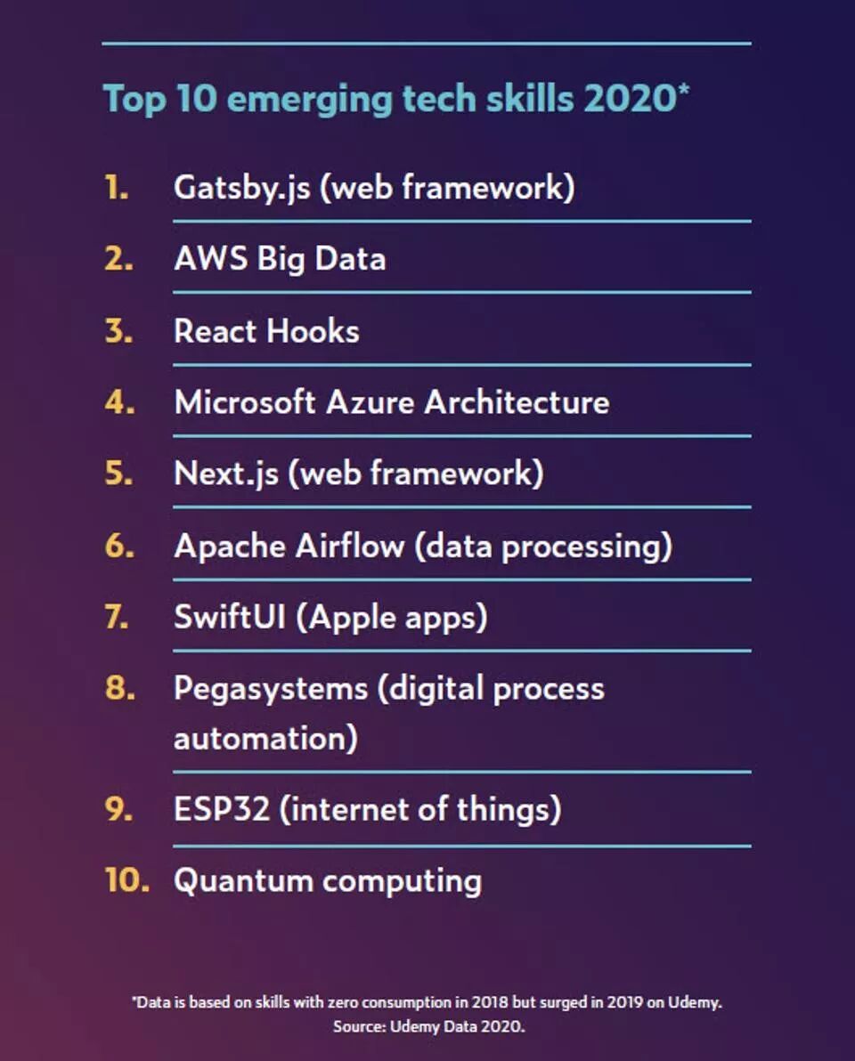 近日在线教育机构 Udemy 根据其 4 千万学员的课程学习情况,对 2020 年的职场技能需求等进行了评估。报告总结了一些值得关注的新技术趋势,包括: