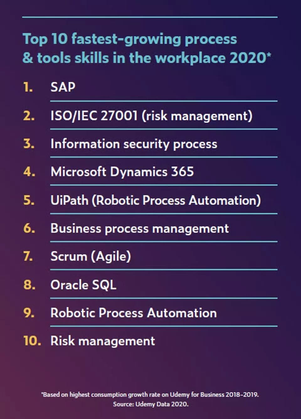2020 年工作场所增长最快的 10 项流程化和工具性技能。
