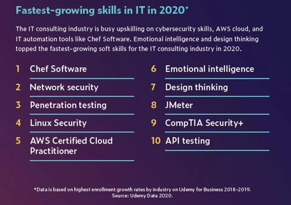 在 2020 年,Chef 软件专业知识、网络安全、渗透测试、Linux 安全和 AWS 认证云预计将成为 IT 从业者中增长最快的技能之一。