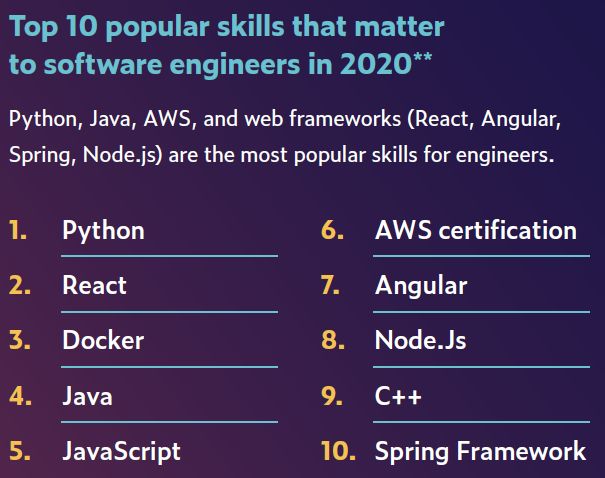 在 2020 年,Python、Java、AWS 和 web 开发框架(React、Angular、Spring 和 Node.js)将成为最受软件工程师欢迎的技能。