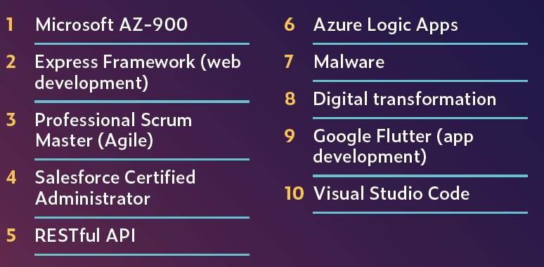 在 2020 年,软件技术服务领域也会提升包括网络开发(如 Express Framework 和 Google Flutter)、Agile 项目管理、微软 Azure 云技术和数字转型等一系列技能。如下图所示,微软 AZ-900、Express Framework(网络开发)和专业 Scrum Master(Agile)成为 2020 年增长最快的软件技术服务技能的前三甲。
