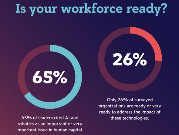 同时,报告指出,65% 的管理者认为人工智能和机器人技术是人力资源中非常值得重视的一部分,但面对这个已经显而易见的时代趋势,只有 26% 的企业表示他们已经准备好了。
