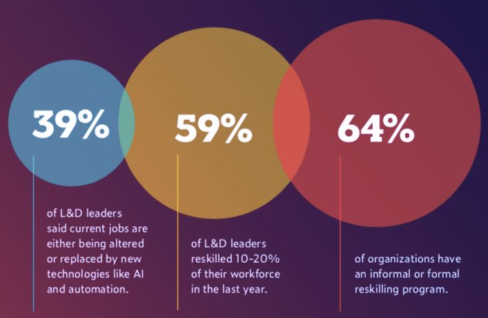 报告显示,60% 以上的公司/组织受到了 AI 的影响,并对其雇员进行了技能培训。而 Udemy 的学习和发展团队(L&D team)中 60% 的成员(一般为企业主等)已对自己公司 10%-20% 的雇员进行了技能培训。而有 4 成的成员认为,现有的一些工作会被 AI 和自动化替代或改变。