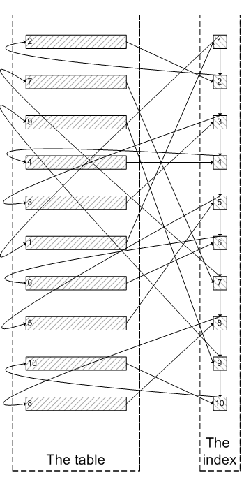 肯定会有人问:既然一开始是利用索引的,为什么不先沿着索引叶子节点查询到最后需要的5个节点,然后再去聚簇索引中查询实际数据。这样只需要5次随机I/O,类似于下面图片的过程: