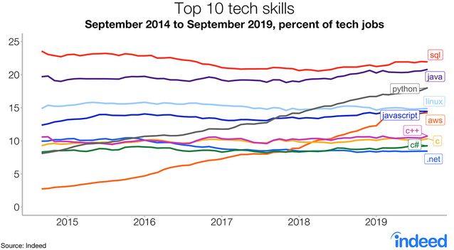 人气飙升的背后是有原因的:Indeed 的研究人员指出,对 Python 技能的需求激增来源于数据科学家和工程师职位的爆发式增长,他们或多或少都会用到 Python。研究人员还指出,全栈开发人员和开发运营工程职位的激增推动了 AWS 的增长。软件工程师和全栈开发人员越来越多地使用 Python,还有一些类似岗位的人员经常使用 AWS。