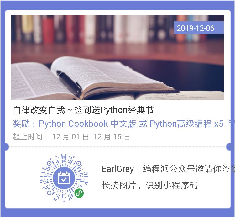 我发起了一个签到送书活动,活动结束后将送出 5 本 Python 技术书。签到次数越多,中奖概率越高。活动详情,请点击:自律改变自我!第①期打卡送书活动启动!
