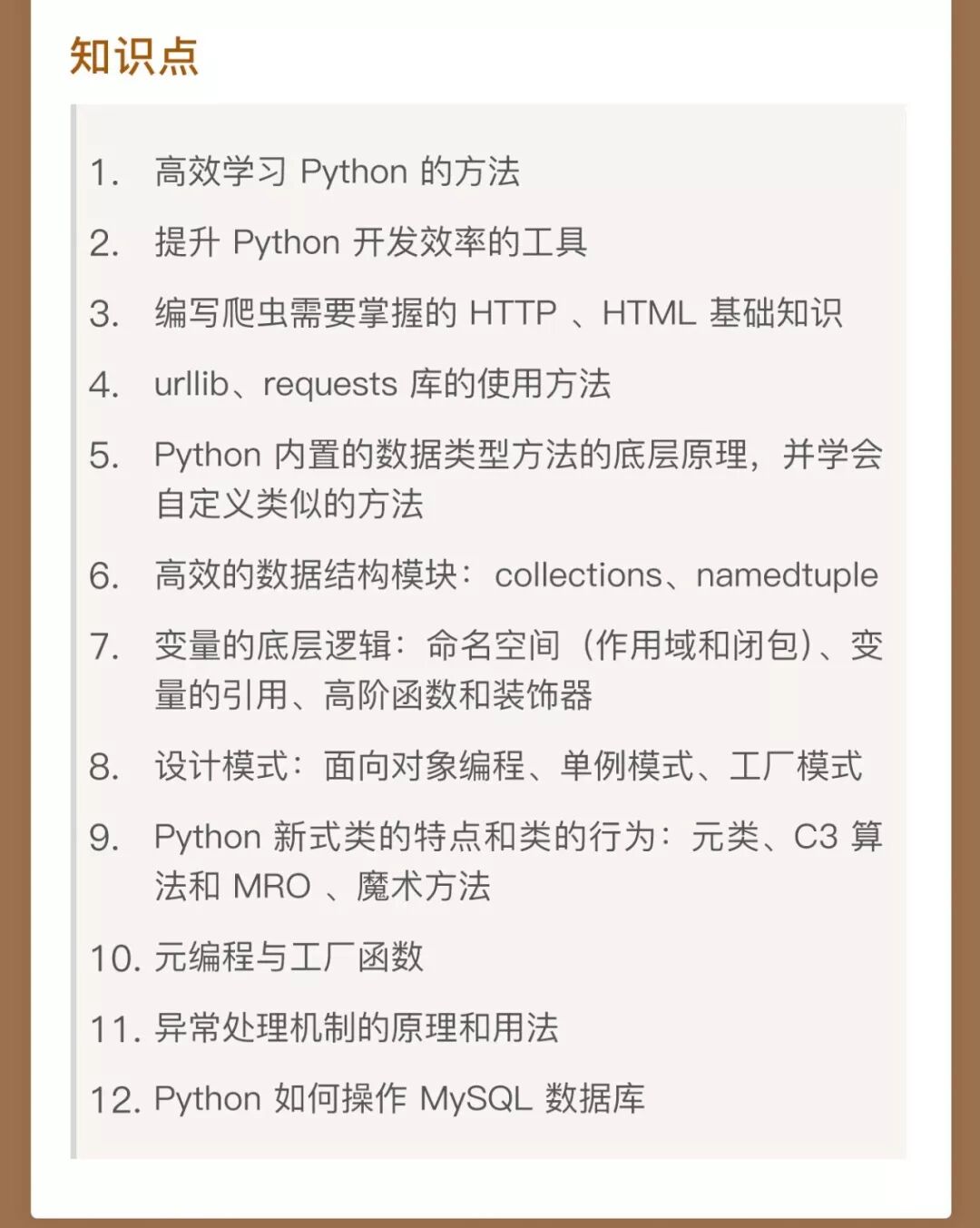 完成以上四步,你就从一个初级的 Python 使用者成长为一名熟练工了。你可以通过课程大纲,更多了解在整个项目开发过程中你能掌握的知识点和技能: