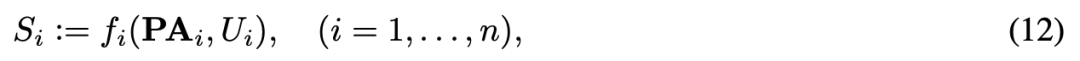 该公式使用确定性函数 f_i,该函数依赖于 X_i 在图中的父亲 PA_i 和随机未解释变量 U_i。图中的有向边表示直接因果关系,因为父亲通过有向边与 X_i 相连,并通过公式 (1) 直接影响 X_i 的任务。噪声 U_i 确保整体目标 (1) 表示通用条件分布 p(X_i |PA_i),噪声集合 U_1, . . . , U_n 是联合独立的。如果它们不是这样,则根据共同原因原理,应存在另一个变量引起它们的相关性,因而该模型不具备充足的因果关系。