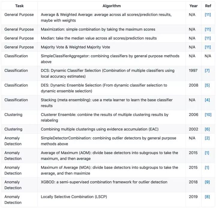 支持多种不同的场景 ,包括分类器合并,原始结果(raw score)合并,聚类合并(对聚类结果进行合并),异常检测器(outlier detector)合并。 未来或许会支持更多不同的场景。