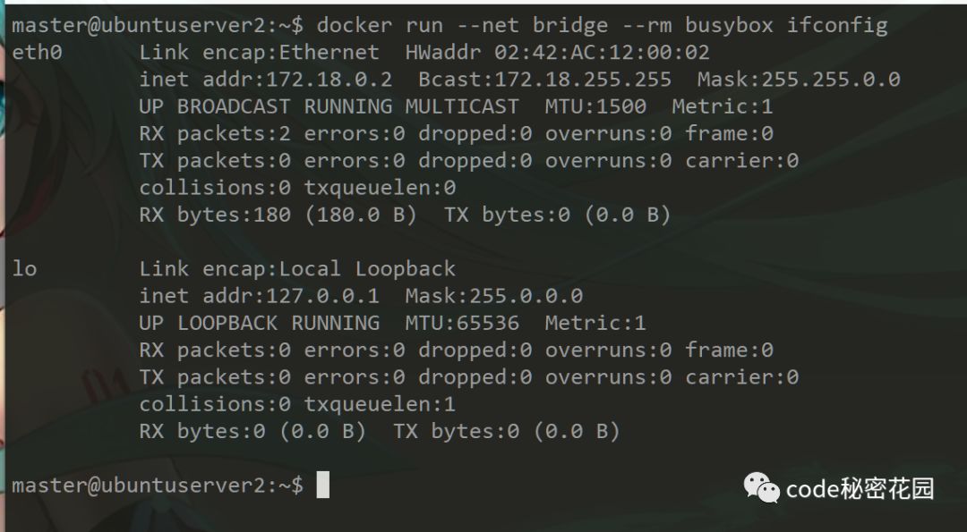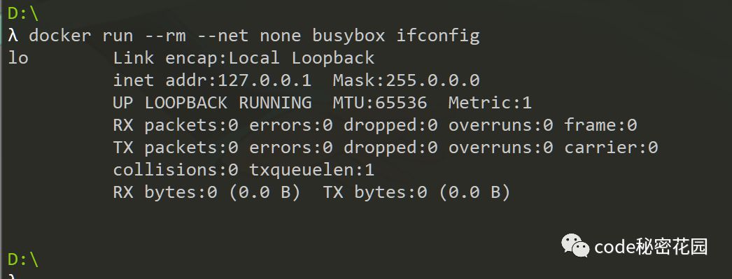 None 模式: docker run --net none busybox ifconfig 指定为 None 模式的容器内将不会分配网卡设备,仅有内部 lo 网络。