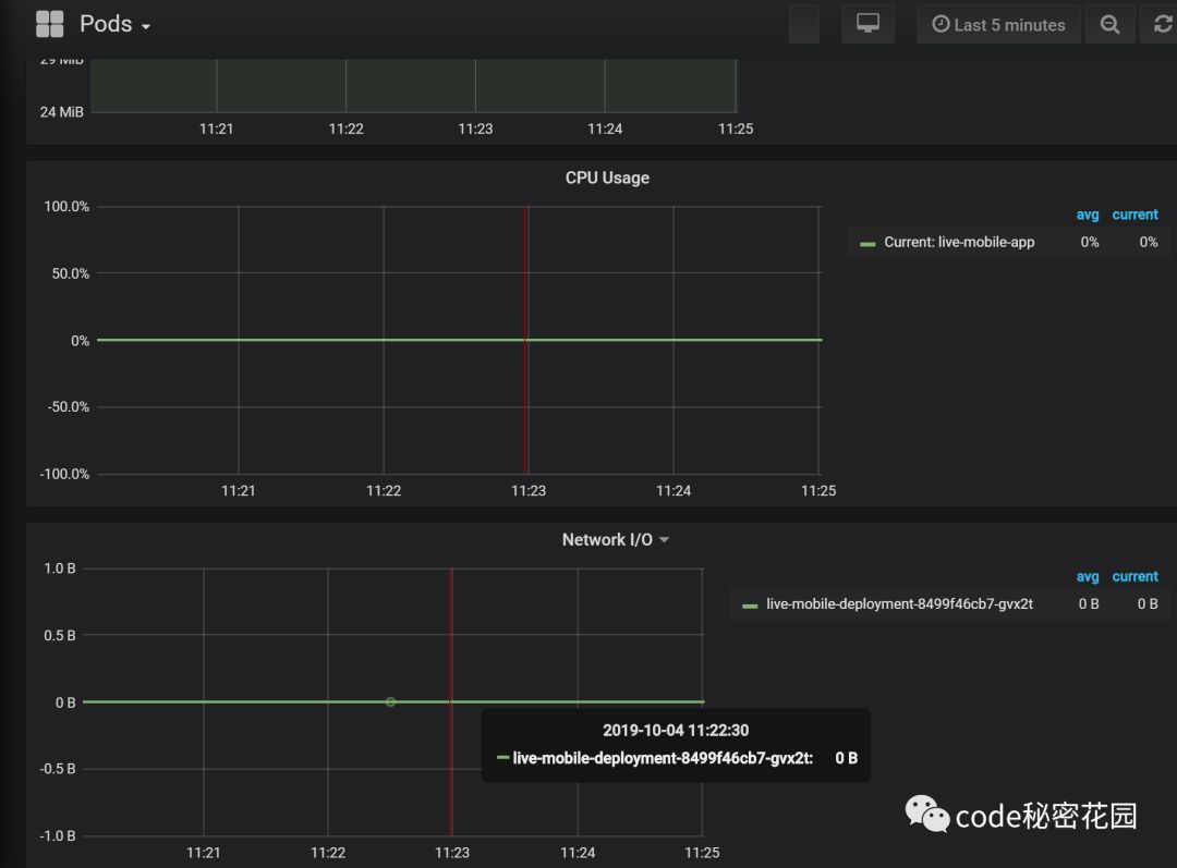 由于容器即是一个进程,所以对容器的监控可以看作对我们 NodeJS 进程的监控,K8S 生态里已经有很多成熟的容器监控方案,例如 Prometheus + Grafana, 使用此可以达到应用的非侵入式性能指标的收集包括: 网络IO / 磁盘IO / CPU / MEM。