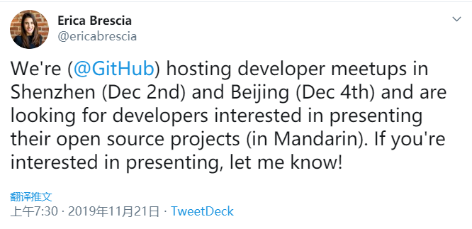 今年9月中旬,她在上海主持了GitHub在中国的首次活动。12月2日,她在深圳与开发者们共同举办了另一次见面活动。12月4日,又在北京共同主办了同类活动。