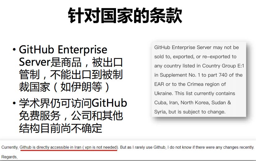 中科院计算所先进计算机系统研究中心主任、中国开放指令生态(RISC-V)联盟秘书长包云岗在《开源项目风险分析与对策建议》报告解读中谈及:GitHub.com明确声明GitHub.com、 GitHub Enterprise Server,以及两者上的信息都是被出口管制的。