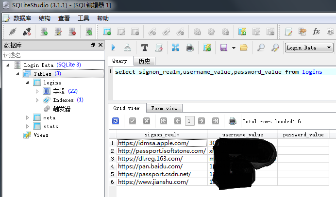 其中logins中就存储这你保存的网址、用户名、密码数据,分别是: