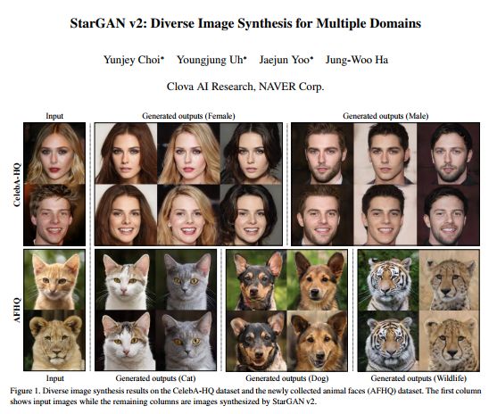 https://arxiv.org/pdf/1912.01865v1.pdfhttps://github.com/clovaai/stargan-v2我们爱GANs!特别是在图像创建和处理方面。这个领域中一个非常有趣的问题就是所谓的“图像到图像转换问题”,我们希望将特征从一个图像域转移到另一个图像域(这里的“图像域”代表可以归类为视觉上独特的类别的一组图像)。我们喜欢CycleGAN和StarGAN等旨在解决此问题的解决方案,因此您可以想象几天前看到StarGAN v2论文时我们有多么兴奋。