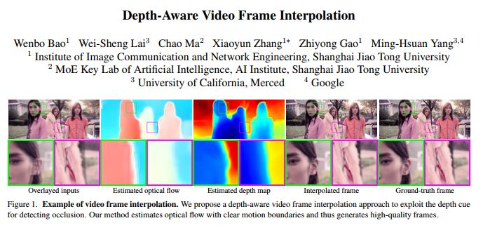 他们创建了称为“深度感知视频帧内插”(Depth-Aware video frame INterpolation,DAIN)的架构。该模型利用深度图、局部插值核和上下文特征来生成视频帧。本质上,DAIN是基于光流和局部插值核,通过融合输入帧、深度图和上下文特征来构造输出帧。