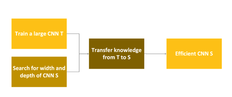 本文实际上一开始就进行了大型网络的训练。然后通过传输体系结构搜索(TAS)提出了搜索小型网络的深度和宽度的建议。最后,使用知识提炼将大型网络中的知识转移到小型网络中。