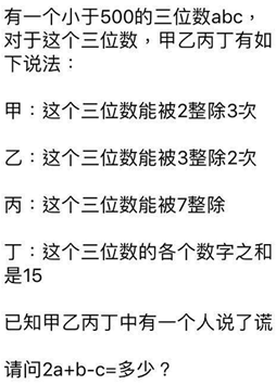 所以乙错了,甲丙丁是对的,此时abc能被8(甲)、7(丙)、3(丁)整除,则abc是8*7*3=168的倍数。小于500的168的倍数有168、336,只有1+6+8=15。