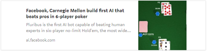 相关链接:https://ai.facebook.com/blog/pluribus-first-ai-to-beat-pros-in-6-player-poker/