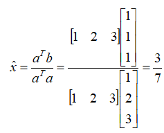 我们举一个简单的一维直线投影例子来实际运用一下上面的公式。已知向量,我们利用公式来寻找一下向量在该向量上的投影向量p,以及任意向量往向量a上的投影矩阵P。