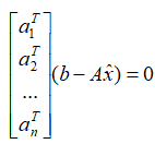 我们在这里仍然需要牢牢的把握住一个核心要点,那就是误差向量e和基向量a之间的垂直关系,因此就有等式成立,我们再进一步对其进行展开,得到了下面的等式关系: