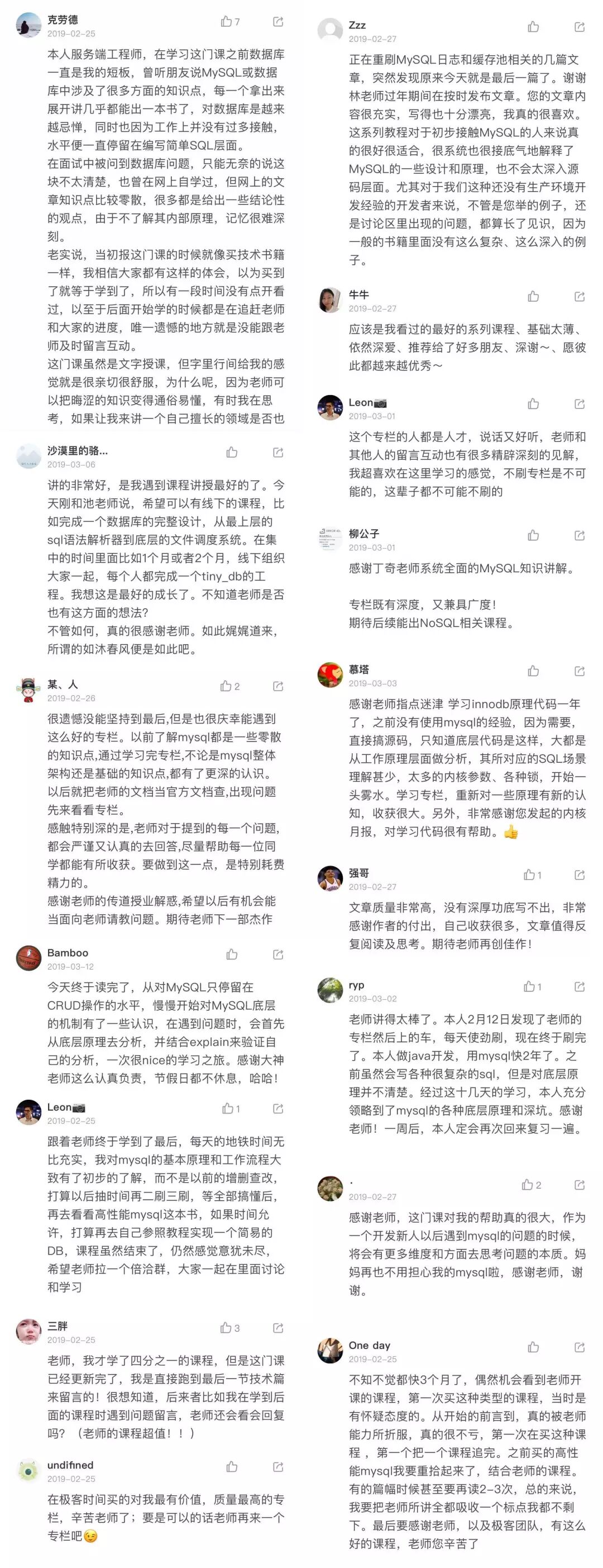 做后端的同学,总是绕不开MySQL。毫无疑问,MySQL 是当下最流行的开源数据库。凭借强大的性能和易于使用性,它已被Google、Facebook、YouTube、百度、网易和新浪等大型互联网公司所应用。更有统计,世界上一流的互联网公司中,排名前20的有80%都是 MySQL 的忠实用户。但我发现,许多人都对如何学习和应用 MySQL 比较迷茫,从开发技巧到管理维护,从性能问题到安全问题,想要一一搞懂,都不是容易的事儿。好在,我之前拜师了一位数据库大佬——丁奇。我想你多多少少听过他的名字,他先后在百度和阿里任职,从事 MySQL 数据库方面的工作。在阿里期间,跟褚霸一起共事,参与了阿里云关系型数据库服务内核的开发,并且负责开发开源分支 AliSQL。给大家show下丁奇整理的MySQL基本架构示意图。大家可以从这个拆解中看看里面都有哪些“零件”,从而对MySQL有更深入的理解。当我们碰到MySQL的一些异常或者问题时,就能够直戳本质,更为快速地定位并解决问题。 跟着丁奇学习,我时常会感慨:大牛果然有成为大牛的理由,如果一开始就有这样从理论到实战的系统性指导,那该多好啊,也许我可以学习得更快些。用丁奇自己的话说,《MySQL实战45讲》专栏他最满意的部分,是每一篇文章都带上了实践案例,也尽量讲清楚了原理。在这个专栏中,丁奇并不想带你去见证 MySQL 是有多复杂,相反,他帮你梳理出学习 MySQL 的主线知识,比如事务、索引、锁等。在这条主线上,每个点就是一个概念、一个机制或者一个原理说明。更难能可贵的是,他还会就开发过程中经常遇到的具体问题和你分析讨论,并且帮你理解问题背后的本质。当然,讲本质的时候,他也会把它涉及的周边知识给你捋一遍。 所以,我想把丁奇的MySQL心法也分享给大家,也就是他在极客时间开的《MySQL实战45讲》专栏。这个专栏可谓字字是丁奇不曾为外人传授的 10 年MySQL经验。现在已经有4万+人加入学习,极客时间2019年最后一波优惠,超值只需 ¥69,原价 ¥99。