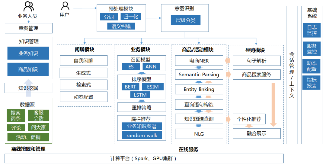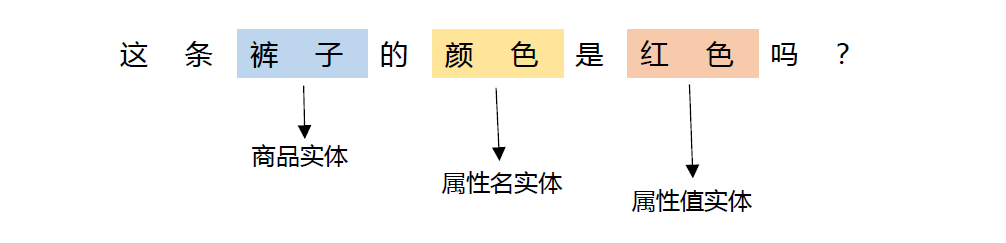 在商品知识问答及导购模块中,我们基于 TensorFlow 构建了电商领域的命名实体识别(NER)模型,用来识别用户问句中的商品名、商品属性名、商品属性值等关键的商品信息(如下图所示),并将实体词送至后续模块,结合知识图谱问答技术生成最终的答案。