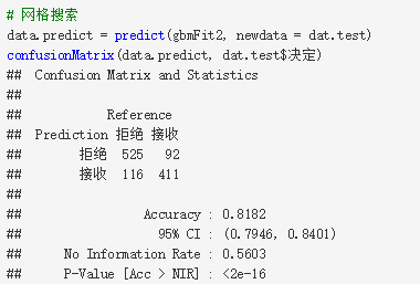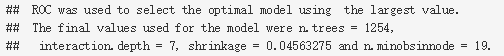 • 第四步:利用train()函数来进行模型训练及得到最优参数组合。该函数会遍历第三步得到的所有参数组合,并得到使评价指标最大的参数组合作为输出。method表示使用的模型,本例使用机器学习中的gbm(Gradient boosting machine)模型,使用的评价指标为ROC曲线面积(即AUC值)。
