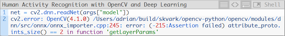 请注意我们的人类活动识别模型要求的OpenCV最低版本是4.1.2.如果你使用的OpenCV版本过低,那么就会收到以下报错信息: