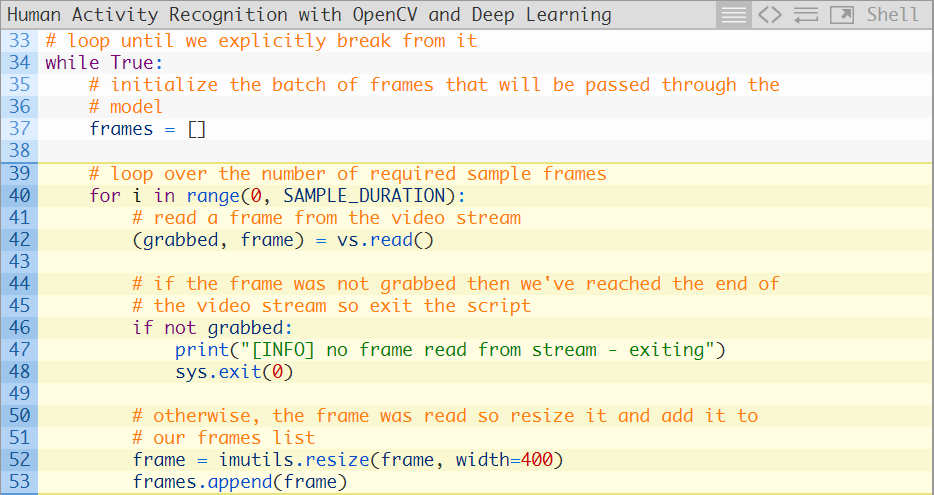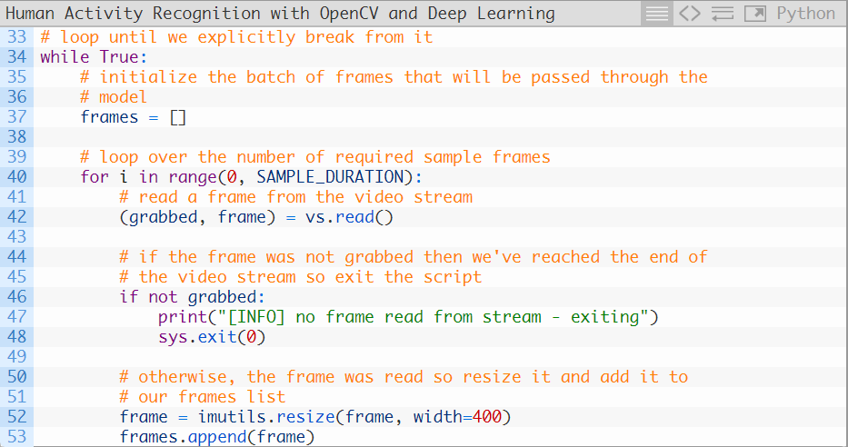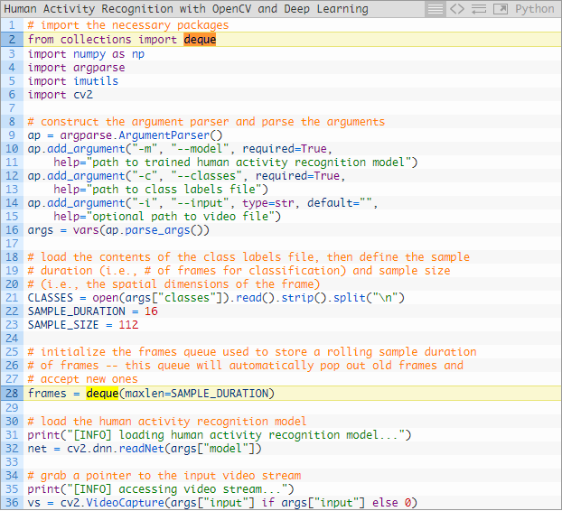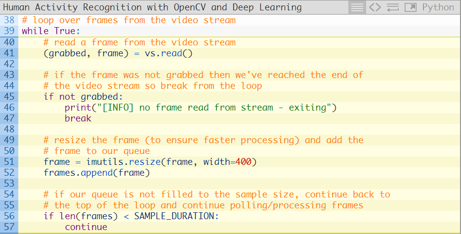 引入的库与之前是完全相同的,除了需要再加上Python中collections 模块的deque 实现(第二行)。在第28行,我们初始化了一个FIFO帧队列,其中最大的长度等于我们的采样时长。我们的“先进先出”(FIFO)队列将会自动弹出最先进入的帧并接收新的帧。我们针对帧队列进行移动推断。其余所有的代码都是相同的,接下来让我们来检查一下处理帧图像的循环: