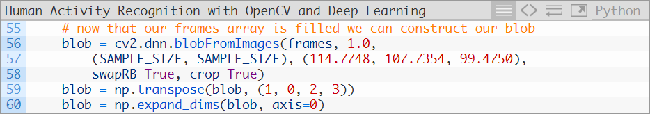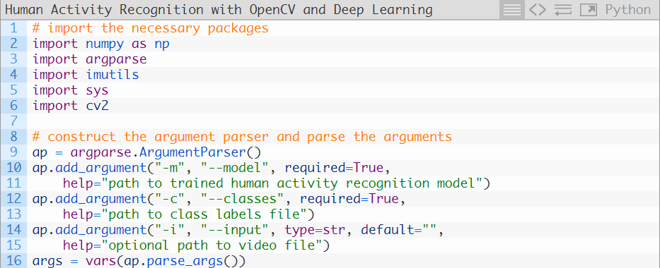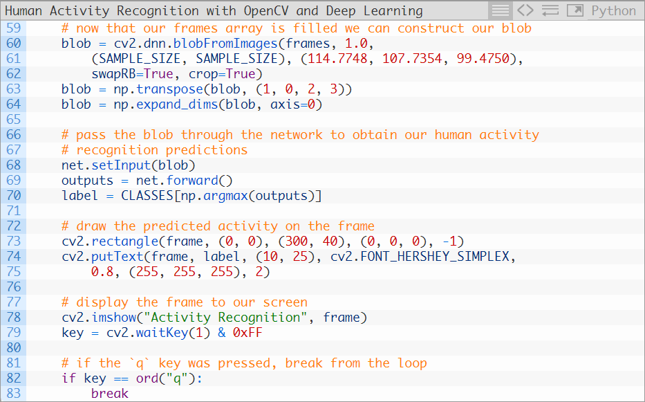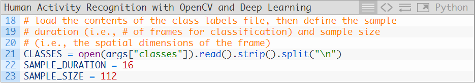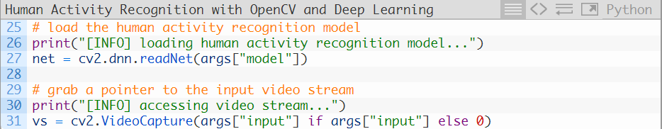 让我们开始使用OpenCV来完成人类活动识别实现。这一实现是基于OpenCV的官方样例,而我又进行了一些调整(都位于这个和下个样例中),并新增了一些注释(对代码的作用进行了详细的解释)。打开human_activity_reco.py文件,来看一下下面这段代码: