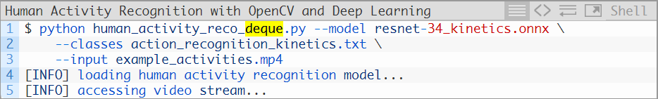 图4:移动预测(蓝色)利用一个完全填充的FIFO队列窗口来进行预测批次预测(红色)不需要一帧一帧地移动。移动预测需要更多的计算力,但对于利用OpenCV和深度学习的人类活动识别来说会有更好的效果。OpenCV的这一dnn模块并不被大多数GPU(包括英伟达的GPU)所支持,我建议你不要对于大多数应用来说还是不要使用移动帧预测。在今天这篇教程的.zip文件中,你会找到一个名为human_activity_reco_deque.py的文件,这一文件包括一个利用移动帧预测的人类活动识别实现。这一个脚本与上一个非常相似,我把它放在这里是让你去尝试一下: