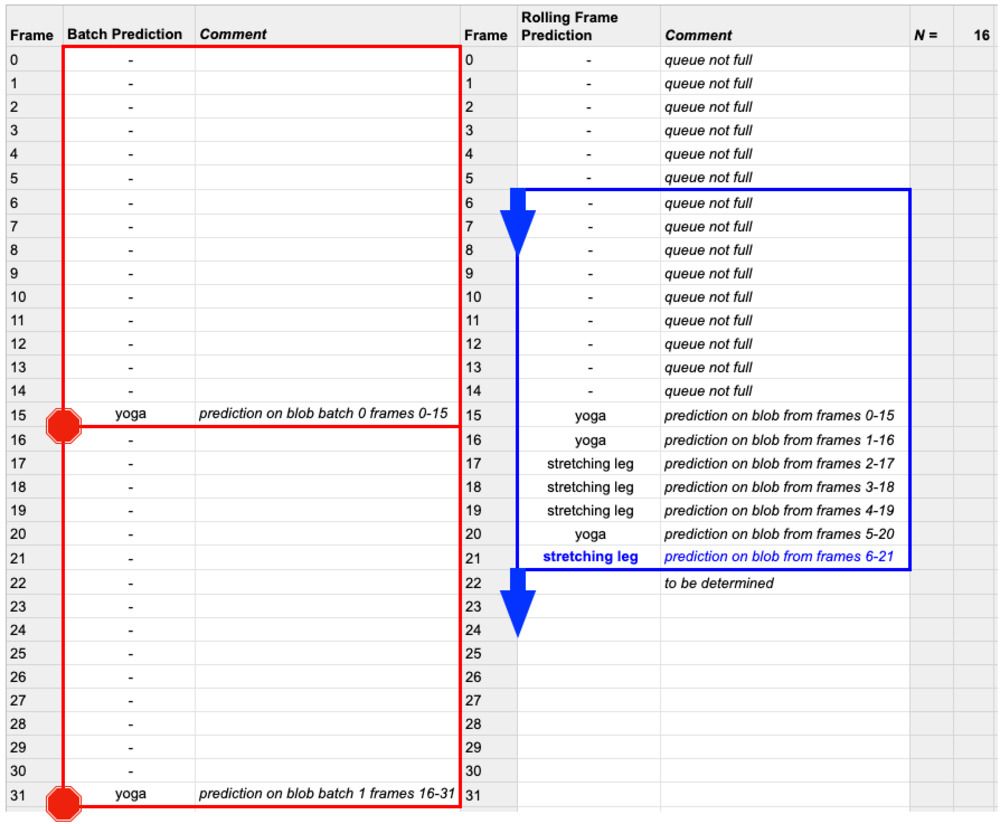 在上一个版本的脚本中,我们抽取了一个带有SAMPLE_DURATION数量帧的一个批次,然后再在这个批次上进行推断。在这个脚本中,我们依旧是以批次为单位进行推断,但现在是移动批次。不同点就在我们在第52行把帧图像放入到了FIFO队列里。如上文介绍,这个队列拥有maxlen 个单位的采样时长,而且队列的头部永远是我们的视频流的当前帧。一旦这个队列被填满,旧的帧图像就会被这个FIFO双端队列实现自动弹出。 这个移动实现的结果就是一旦当队列被填满,每一个给出的帧图像(对于第一帧图像来说例外)就会被“触碰”(被包含在移动批次里)一次以上。这个方法的效率要低一些;但是它却能获得更高的活动识别准确率,特别是当视频或现场的活动周期性改变时。第56和57使得我们的帧队列在做出任何推断之前,把帧对列填充好。(例如在图4蓝色区域的前16帧所显示的)。一旦这个队列被填满,我们将可以执行一个移动的人类活动识别预测: